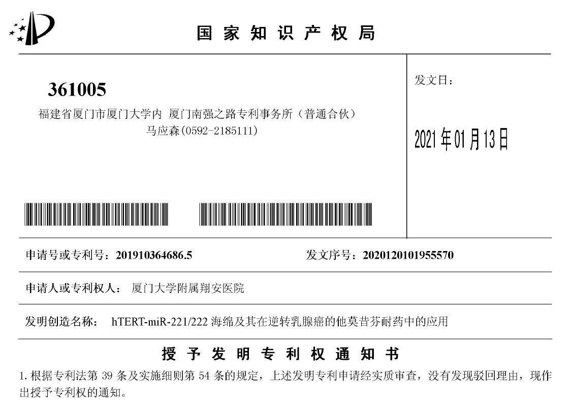 1月13日,张国君教授团队的上述发明专利获国家知识产权局授权,这也标志着厦门大学附属翔安医院在TAM耐药乳腺癌的治疗研究达到国内先进水平。