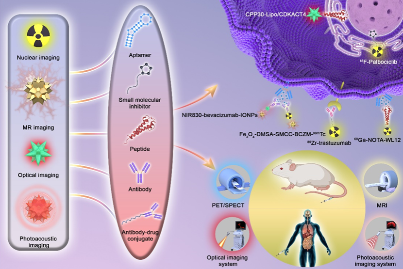 肿瘤靶向治疗是精准医学的基石,近几十年取得了长足的进步。靶向治疗药物不同于常规的化疗药物,不是通过损害所有快速分裂的细胞,而是通过干扰参与癌症生长、进展和扩散的特定信号通路来阻止癌细胞的生长。临床上一般通过实体瘤的疗效评价标准(RECIST),用卡尺测量靶病灶大小的变化、或利用传统的基于解剖成像的影像学方法,如CT和MRI等来评估肿瘤对治疗的反应。然而,RECIST标准在评估靶向治疗的疗效时不准确,因为靶向治疗引起的肿瘤坏死与肿瘤大小变化之间的相关性较差,或存在延迟反应,导致不能及时更换治疗方案,一是造成延误治疗,且患者还不得不承受药物带来的不良反应,二是造成医疗资源的浪费。创新的分子和功能成像技术与传统的成像技术相比在以下几个方面有优势:(1)可以全身成像:如通过免疫-PET,可以更好地显示靶分子在肿瘤内和肿瘤间表达水平的变化。(2)可以早期成像:通常是治疗后几天就显示肿瘤功能状态的变化,能够早期发现耐药性和预测长期疗效。张国君教授曾在2022年发文,报道了光学分子影像技术可在乳腺癌模型动物上可视化、精准评估CDK4/6抑制剂帕博西利用药一周后的疗效(In vivo visualization of fluorescence reflecting CDK4 activity in a breast cancer mouse model)。(3)可以无创监测靶向分子的表达变化:在细胞、亚细胞甚至分子水平可视化、表征和量化靶点的表达水平变化或酶活性变化,从而更早评估靶向治疗的疗效,优化治疗策略。