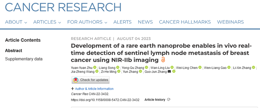 近日,张国君团队在肿瘤学老牌期刊Cancer Research(Nature Index期刊,中科院医学、肿瘤学1区Top期刊,影响因子:11.2)发表“ Development of a rare earth nanoprobe enables in vivo real-time detection of sentinel lymph node metastasis of breast cancer using NIR-IIb imaging ”的研究论文,阐述了该团队构建的一种新型近红外二b区分子探针及手术导航模式,可在体实时识别乳腺癌前哨淋巴结转移状态,进而避免了不必要的前哨淋巴结活检术,预期可进一步降低淋巴水肿发生率。厦门大学医学院博士研究生朱媛媛、中国科学院海西研究院宋良副研究员和汕头大学医学院附属肿瘤医院张永渠教授为论文的共同第一作者,中国科学院海西研究院张云研究员和张国君教授为论文的通讯作者。该研究得到国家自然科学基金重大研究计划培育项目、福建省科技重大专项专题等基金的资助。