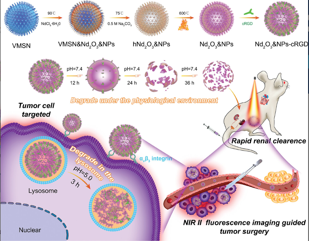 保乳术联合术后放疗为早期乳腺癌的标准治疗方式,保乳术成功的关键在于平衡乳腺肿瘤的完全切除和尽可能地保留正常组织以获得最佳美容效果。据报道,约20-40%的患者因手术边缘阳性而接受第二次手术,致使保乳术效果和满意度大打折扣。如何实时、精准判断保乳术切缘情况是降低二次手术的关键。光学成像由于其具有非侵入性、高时空分辨率、无电离辐射、可实时动态反馈信息等优点,在手术导航中独具优势。相较于NIR-Ⅰ,NIR-II荧光成像降低了组织自荧光、光散射、光吸收,提高了组织穿透深度、成像分辨率、信噪比,有望实现更为精准的术中导航。Nd基纳米晶体具有优异的NIR-II荧光成像特性,如窄峰和多峰发射,长发光寿命和良好的光稳定性。然而,由于体内毒性,在网状内皮系统中的长期积累限制了它们的临床应用。为解决上述问题,该研究通过多学科交叉,合成了一种可生物降解的中空病毒样氧化钕纳米探针(Nd2O3&NPs),该探针被环精氨酸-甘氨酸-天冬氨酸(cRGD)五肽修饰,最终得到一种新型靶向性的可降解纳米探针Nd2O3&NPs-cRGD。研究显示,该探针对乳腺癌细胞系及荷瘤小鼠具有高度特异的肿瘤靶向性,并在皮下移植瘤模型及模拟人乳腺癌发病模式的MMTV-PyVT自发性乳腺癌转基因小鼠中都可显著提高NIR-II荧光成像引导乳腺癌手术的精准性,引导术者对荷瘤小鼠进行精准的外科手术切除,显著提高了无复发生存率。另外,在模拟保乳切缘的自发成瘤模型中,Nd2O3&NPs-cRGD可精准识别阴性与阳性切缘,具有较高的诊断效益,受试者工作特征曲线下面积达0.97。
