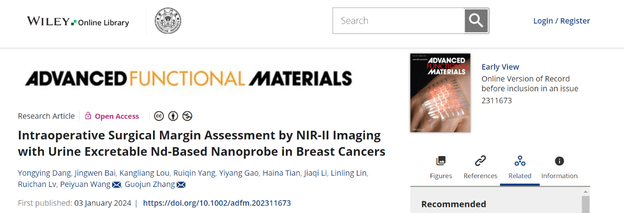 近日,福建省乳腺癌精准诊治重点实验室主任张国君教授团队在国际知名综合性期刊Advanced Functional Materials(中国科学院1区Top期刊,影响因子: 19)发表了“Intraoperative Surgical Margin Assessment by NIR-II Imaging with Urine Excretable Nd-based Nanoprobe in Breast Cancers”的研究论文,阐述了该团队构建的一种新型氧化钕纳米探针,该探针具有NIR-II荧光成像导航手术功能,克服了近红外一区(NIR-Ⅰ)荧光成像技术的不足,提高了分辨率、信噪比和手术有效性;此外,该探针在体内酸性环境中可快速降解,并经肾脏快速排泄,或可解决镧系钕离子在体内长期滞留而产生的毒性问题。厦门大学医学院博士研究生党永颖和厦门大学附属翔安医院白静雯主治医师为该论文的共同第一作者,中国科学院海西研究院王培园副研究员和张国君教授为论文的通讯作者。该研究得到国家自然科学基金、福建省科技重大专项专题等项目的资助。