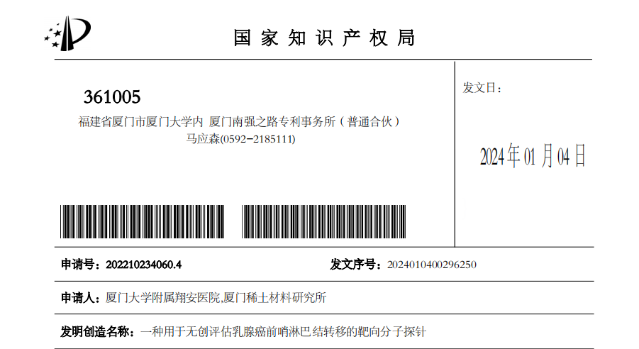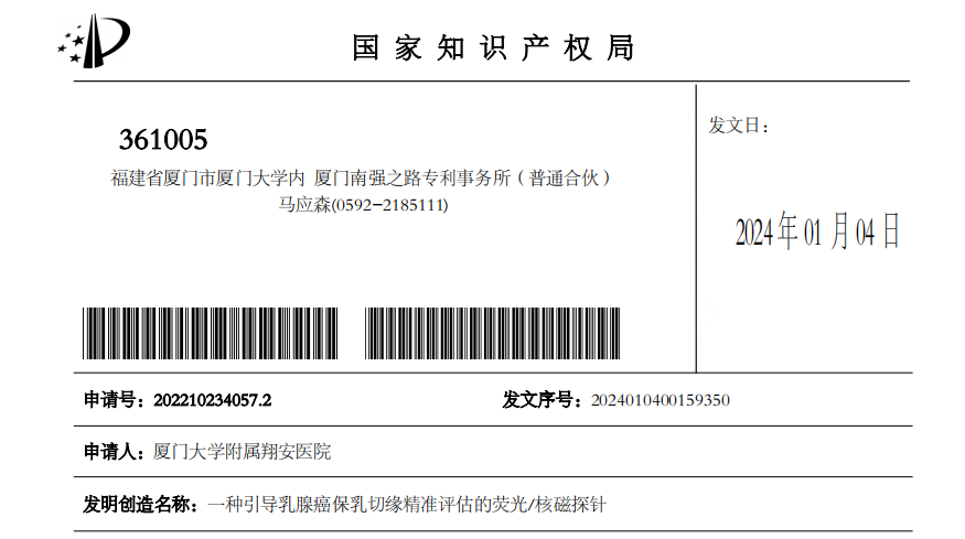 近日,张国君课题组研究成果“一种引导乳腺癌保乳切缘精准评估的荧光/核磁探针”和“一种用于无创评估乳腺癌前哨淋巴结转移的靶向分子探针”同时获得国家发明专利授权。这两项专利聚焦于乳腺癌外科治疗临床领域的“痛点”——难以精准识别保乳切缘、难以在体识别前哨淋巴结状态。针对上述临床“痛点”,张国君课题组与厦门稀土材料研究所、厦门大学化学化工学院进行多学科交叉合作,基于自组装技术和稀土材料制备了新型的近红外二区荧光探针,巧妙地研发了可精准导航保乳手术切缘和无创识别前哨淋巴结转移状态的新型分子探针。未来,有望将这类新型体系应用于保乳手术导航或腋窝前哨淋巴结在体、无创活检的临床实践,造福广大的乳腺癌患者。