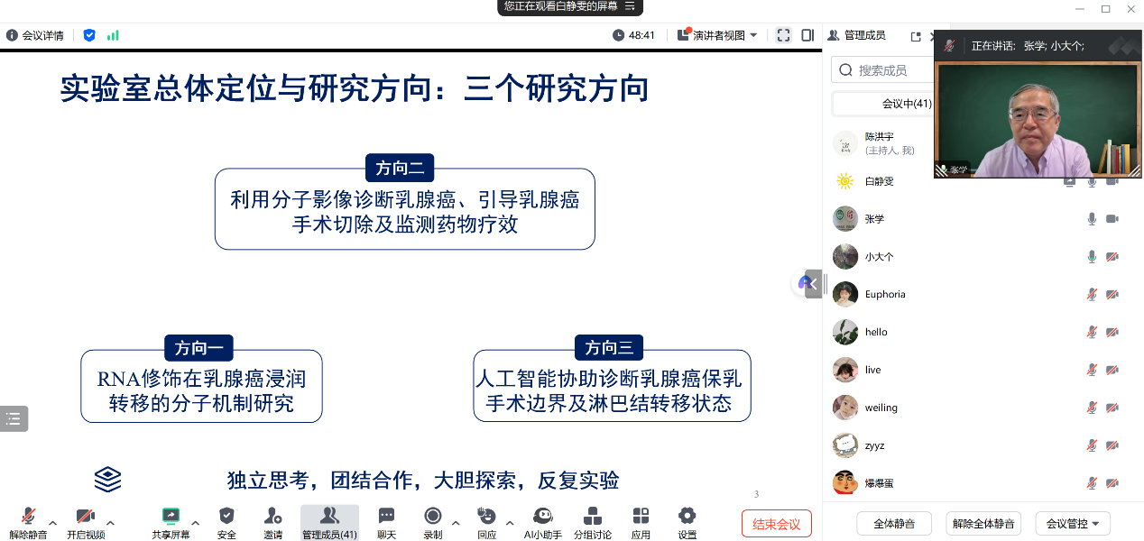 实验室主任张国君教授致欢迎辞,并感谢各位委员对重点实验室建设与发展给予的支持、关心和指导。会议由张学院士主持,白静雯副主任医师代表本实验室就各个研究方向,向学术委员会汇报了年度研究概况以及来年计划。