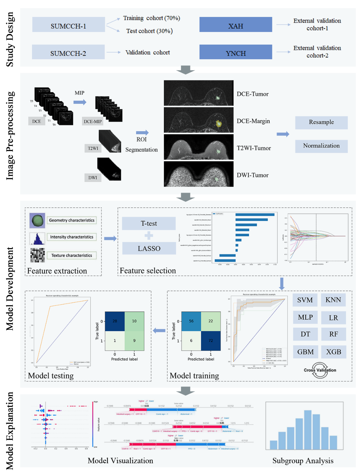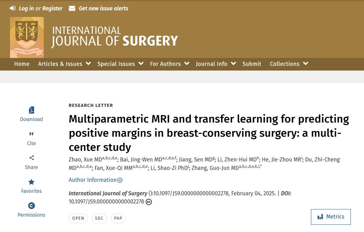 近日,福建省乳腺癌精准诊治重点实验室主任、北京大学肿瘤医院云南医院(云南省肿瘤医院)张国君教授团队在国际知名期刊International Journal of Surgery(中科院2区,JCR 1区,影响因子: 12.50)发表了题为“Multiparametric MRI and Transfer Learning for Predicting Positive Margins in Breast-Conserving Surgery: A Multi-Center Study”的研究论文,该研究结合多参数乳腺磁共振成像(mpMRI)和迁移学习(TL)技术,基于来自三家中国医院共444名乳腺癌保乳手术患者的数据,成功构建了一种新型的乳腺癌保乳手术切缘预测模型。厦门大学医学院博士研究生赵雪、云南省肿瘤医院乳腺中心白静雯副主任医师、汕头大学医学院附属肿瘤医院放射科江森主治医师和云南省肿瘤医院放射科李振辉副主任医师为本文共同第一作者,张国君教授为本文通讯作者。相关工作得到了国家自然科学基金、云南省科技厅社会发展重点研发计划、云南省肿瘤医院横向项目和科研启动资金等7项基金的资助。