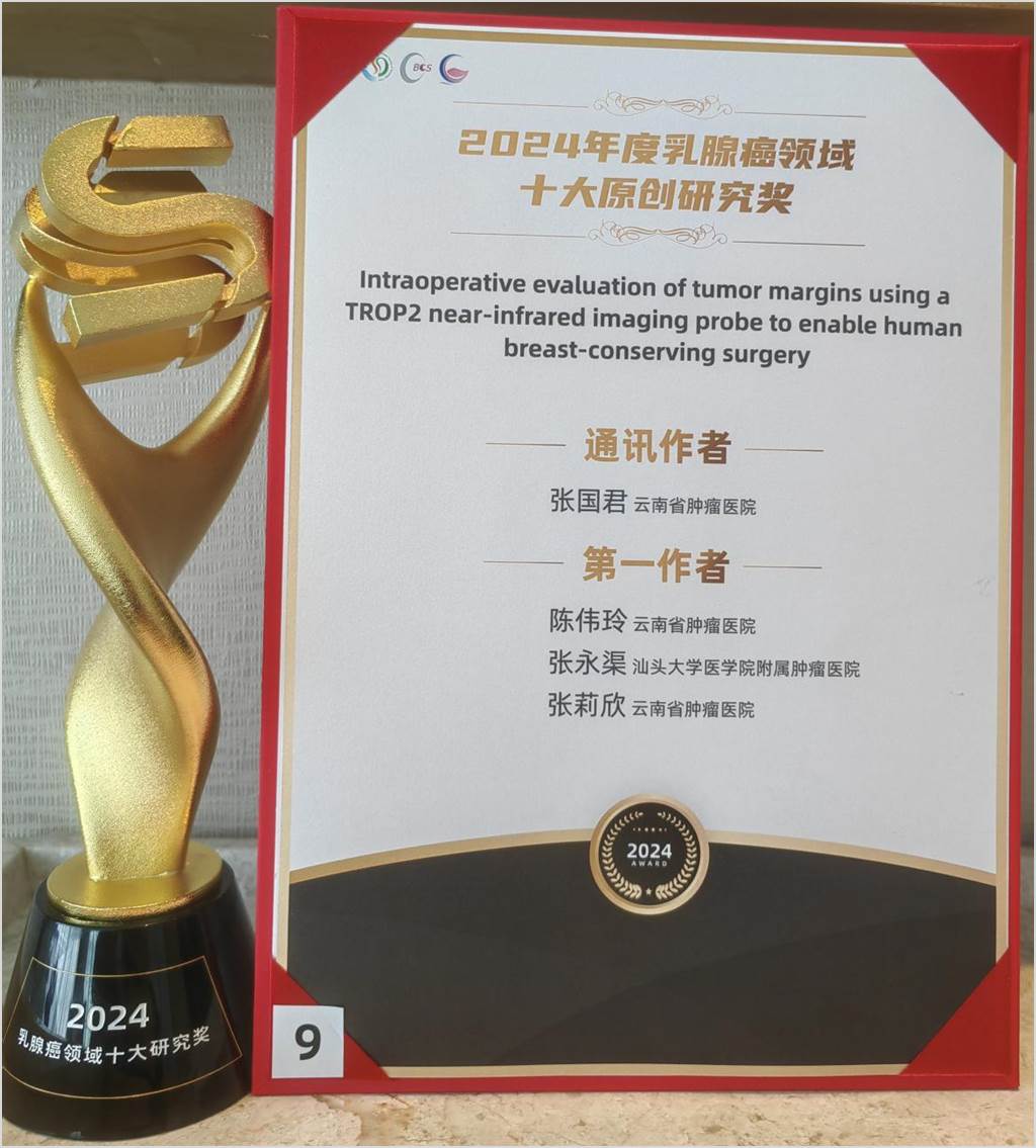 近日,由北京大学肿瘤医院云南医院(云南省肿瘤医院)院长、福建省乳腺癌精准诊治重点实验室主任张国君教授领衔的科研团队,凭借其自主研发的“乳腺癌术中肿瘤切缘精准评估分子影像技术”,成功入选中华医学会乳腺肿瘤学组评选的“2024年度乳腺领域十大原创研究”。该奖项经过对国内年度高水平科研成果的严格遴选,代表了中国乳腺医学创新研究的顶尖水平。同时,此项技术已获国家专利局授权专利,标志着我国在肿瘤精准诊疗领域取得又一创新成果。