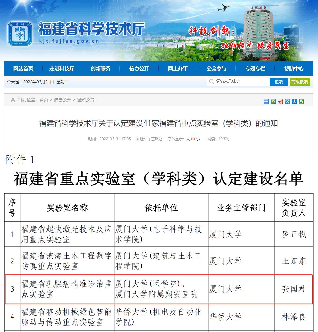 今日,福建省科学技术厅发布了《福建省科学技术厅关于认定建设41家福建省重点实验室(学科类)的通知》(闽科基〔2022〕1号)。历经限额推荐、现场答辩、现场核查、会评等环节,厦门大学附属翔安医院执行院长张国君教授作为负责人的“福建省乳腺癌精准诊治重点实验室”榜上有名,成为翔安医院自2019年4月开业以来获批的第一个省级重点实验室,实现了翔安医院省级重点实验室“零”的突破,该实验室也是福建省乳腺癌领域首个重点实验室。这是上级部门和专家对翔安医院乳腺癌诊治研究水平的认可,也是对高水平学科建设与发展的期望。